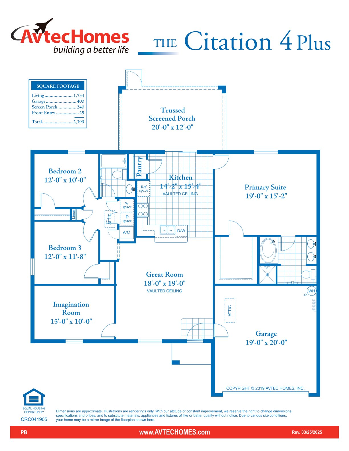 Now with even more living space, the Citation 4 Plus is equipped with all the same quality features you've come to expect from Avtec Homes. At 1,734 total square feet of living area, this jumbo version gives you a larger den, larger main living area, and a completely redesigned and spacious primary suite retreat -- with an enormous walk-in closet! The large eat-in kitchen is open to the living room so you can stay connected with all the action and keep an eye on dinner. With more room to spread out, the Citation 4 Plus is a new favorite! Your low monthly payment will include a fully prepped and sodded homesite, concrete block construction, birch cabinetry, deluxe appliances, a two-car garage, a 10-year structural warranty, and room enough to make your dreams come true. Why wait, when the new Citation 4 Plus is perfect in every way?